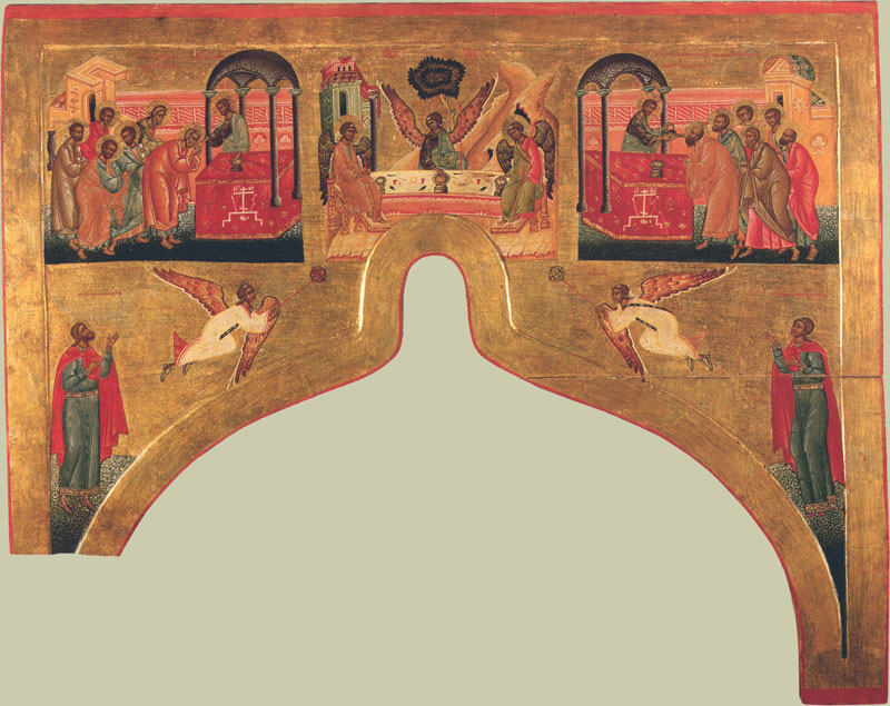 Доска липовая, из четырех частей; одна врезная сосновая шпонка (вместо утраченной второй шпонки сделана новая реставрационная); ковчег, паволока, левкас меловой, яичная темпера, золото. В нижней половине Сень имеет фигурный вырез, соответствовавший форме верхней части створок Царских врат.